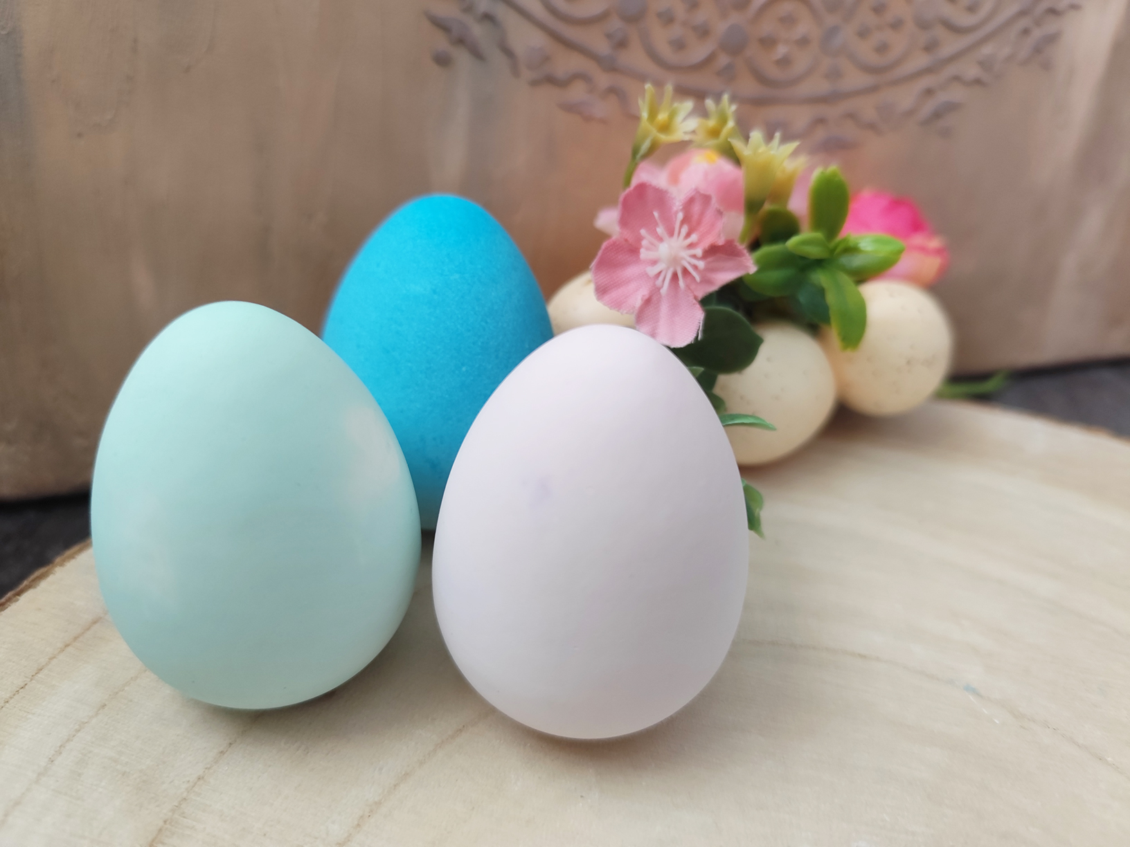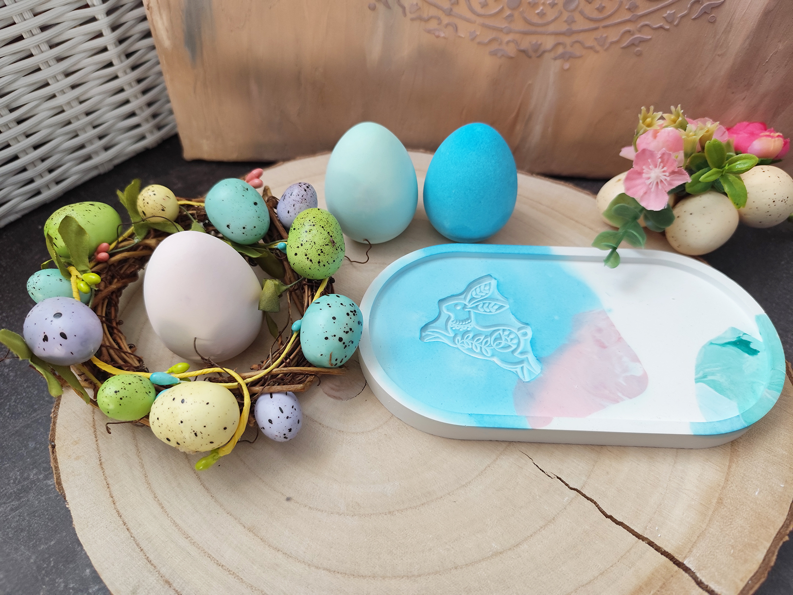 Anyagában színezett (zöld, kék, rózsaszín) márványos tojások és tálca, melyen nyuszi minta található.