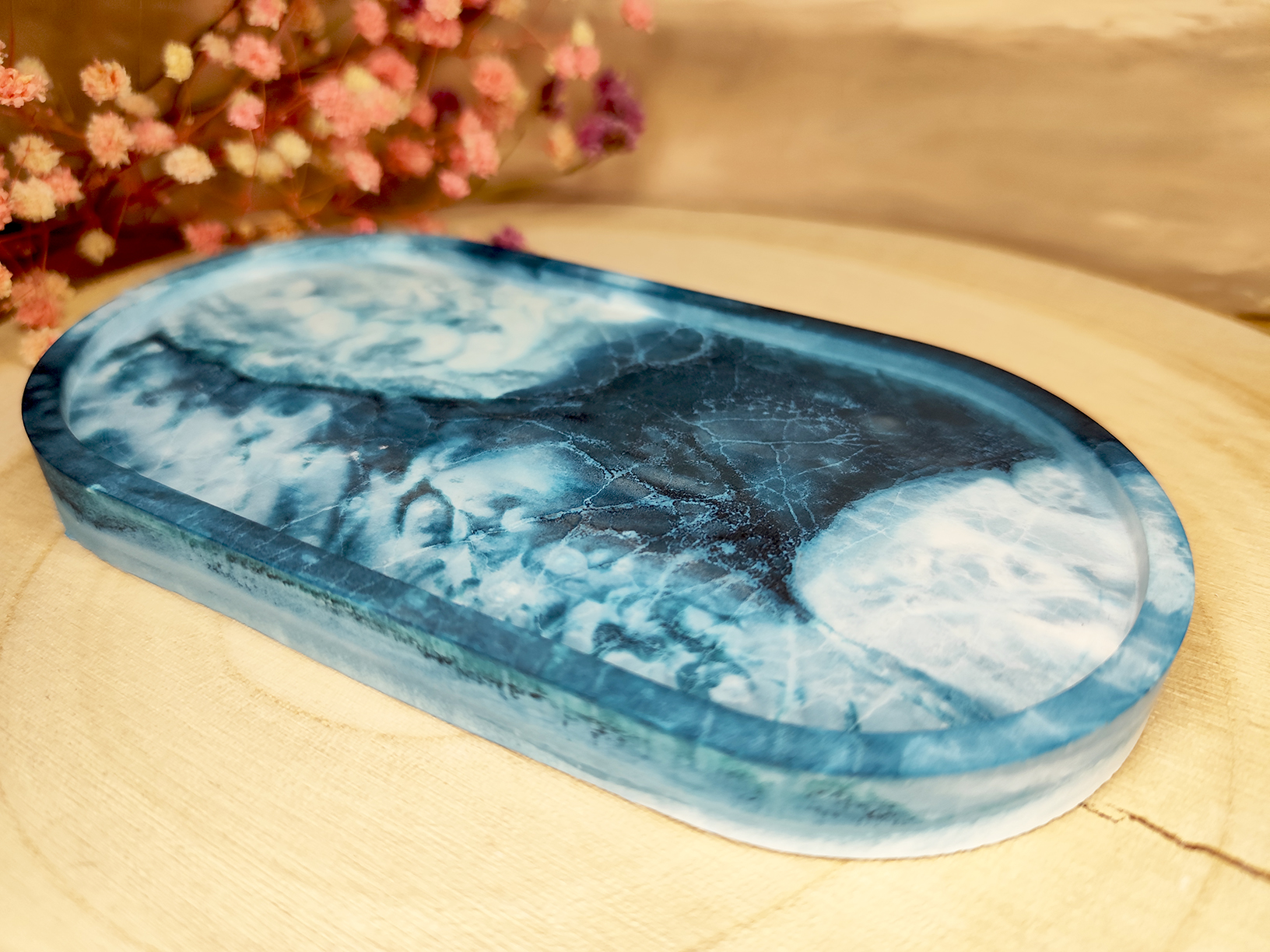 A márványos hatás és a mély, vízszerű színvilág nyugalmat és harmóniát visz a térbe.