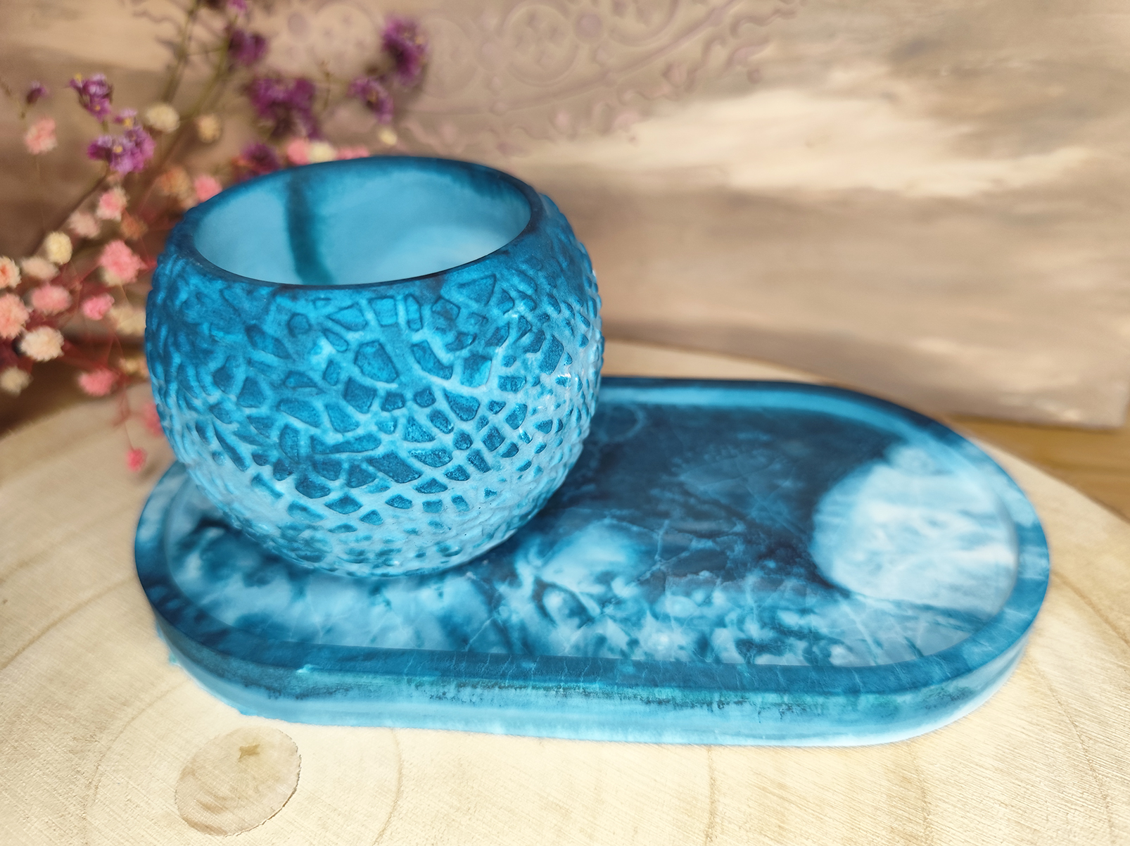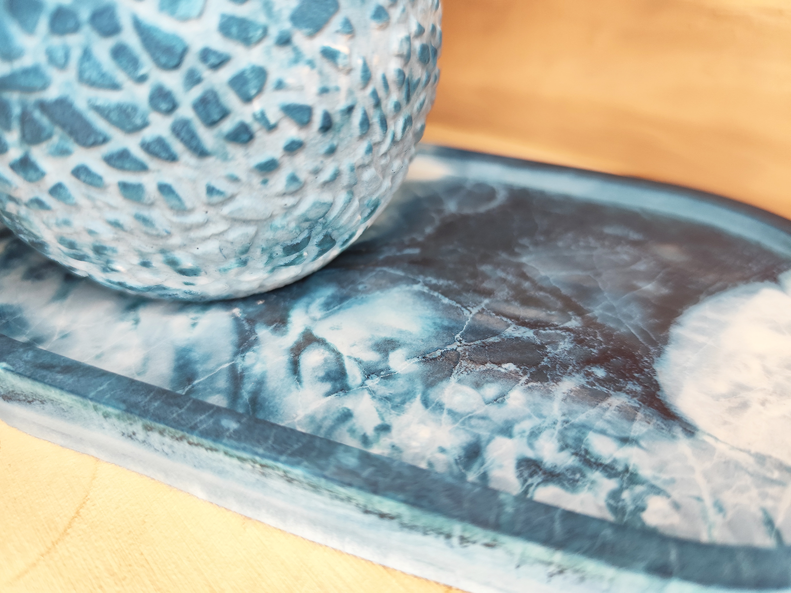 Ez a különleges, kék árnyalatokban játszó kézzel készült dekor szett egy tálcából és egy hozzá illő, texturált felületű tartóból áll.