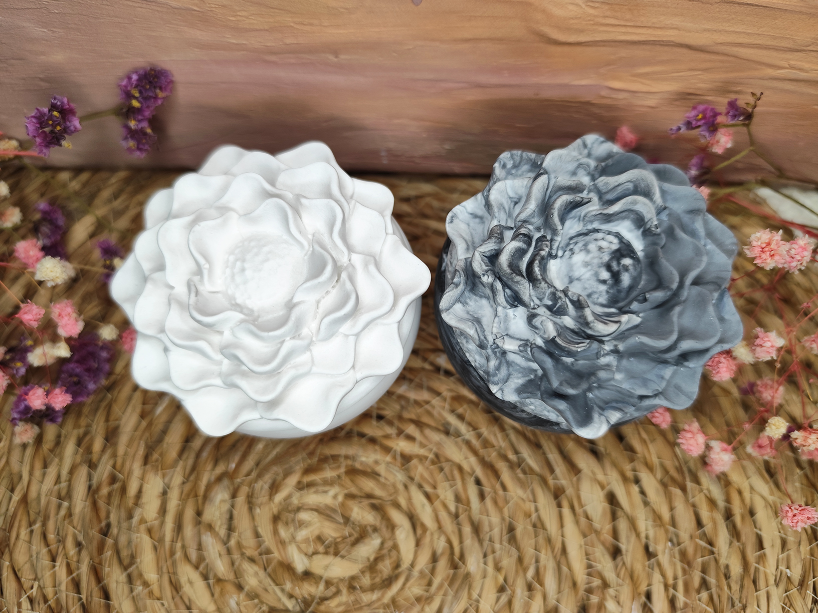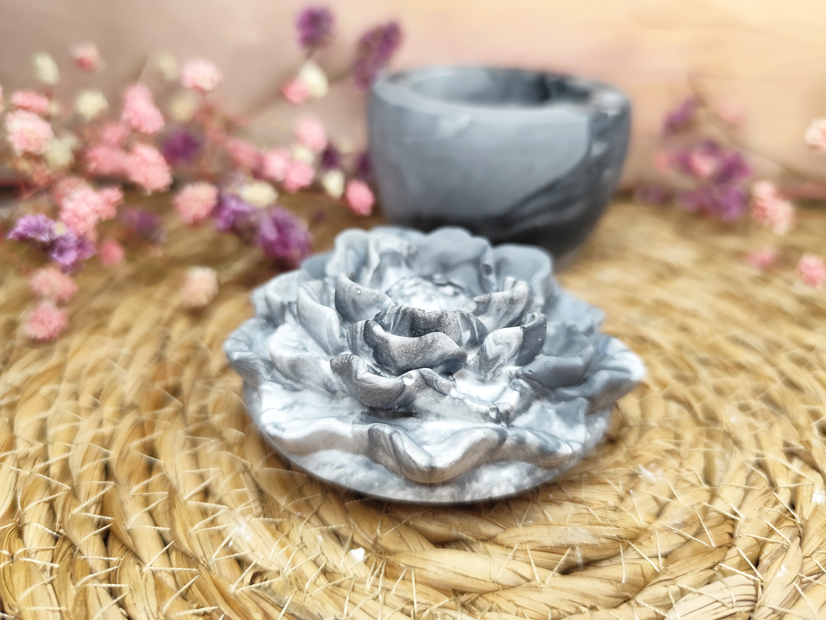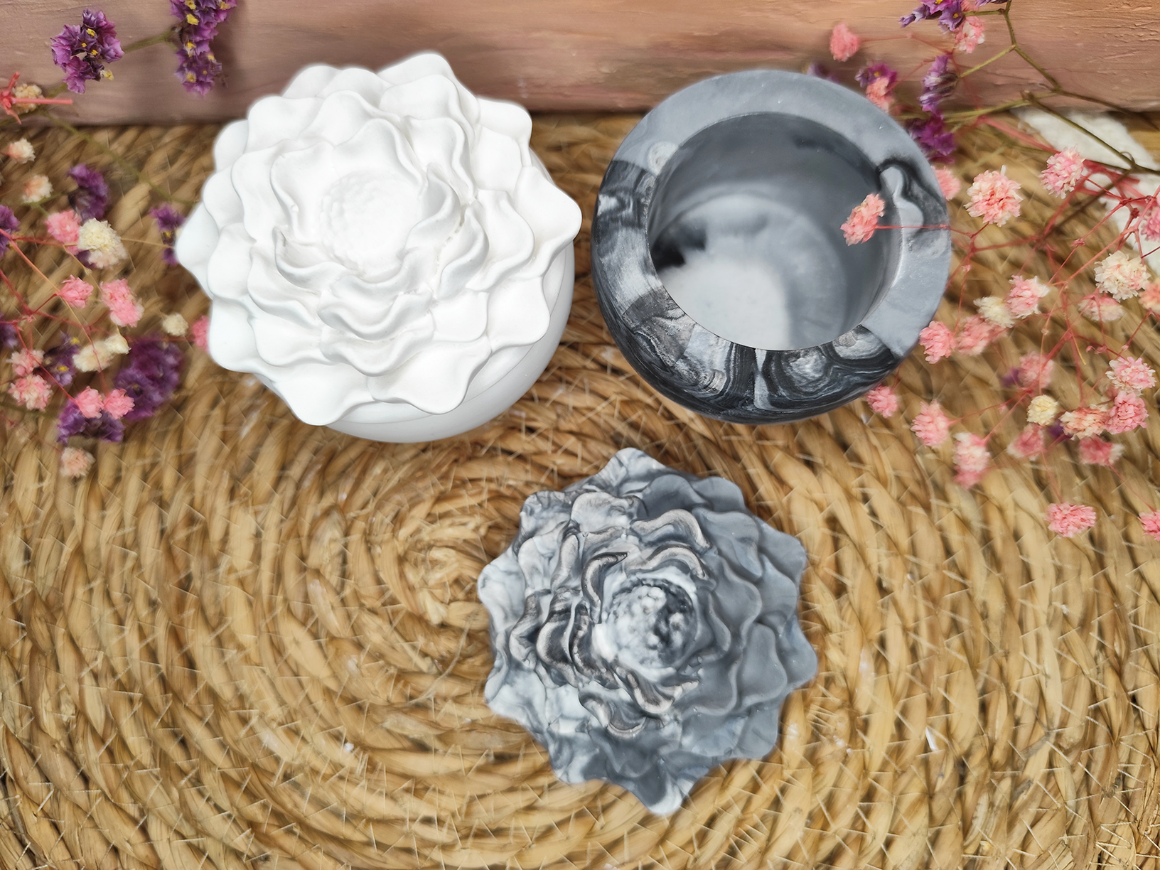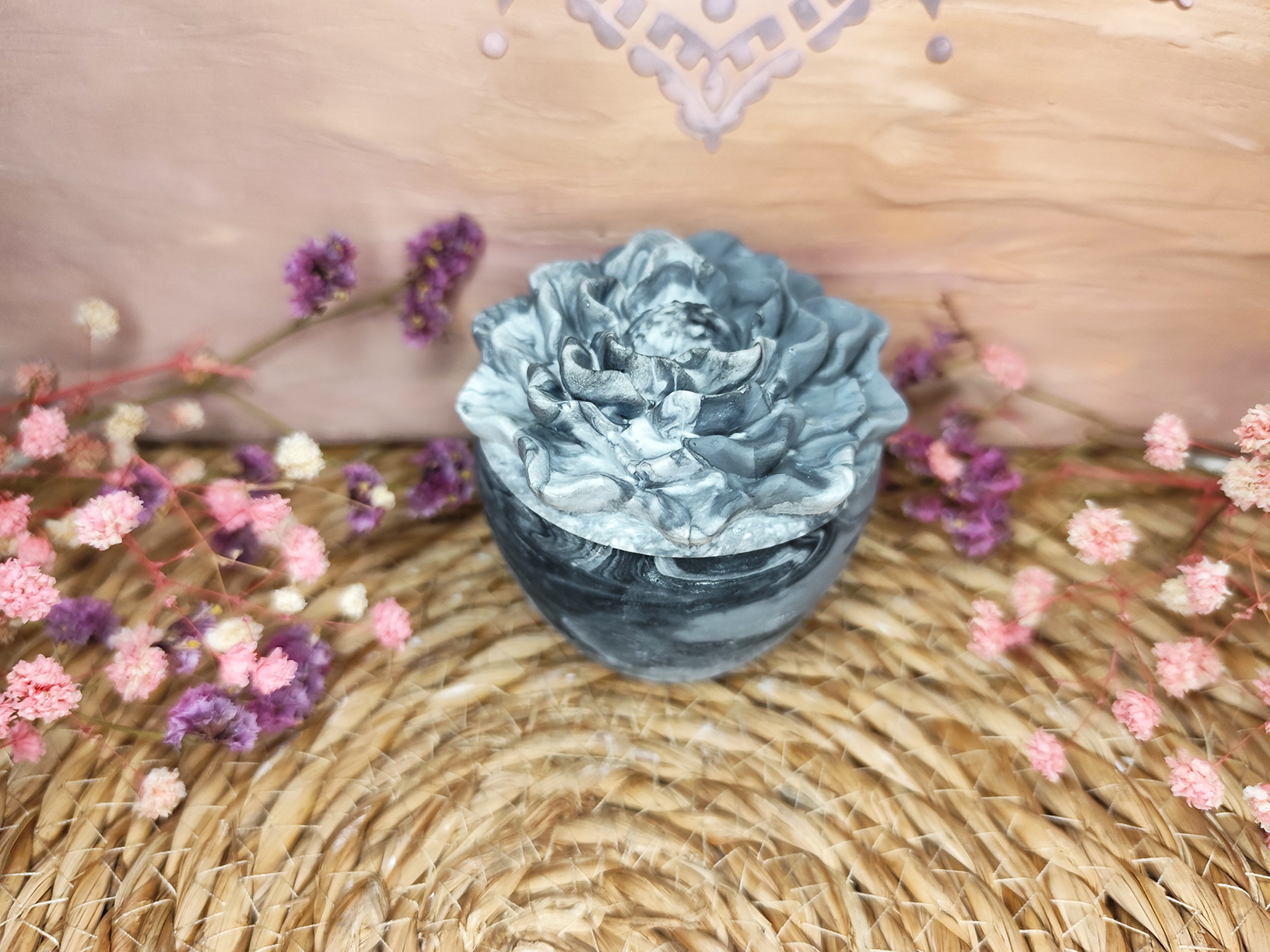Kamélia formájú, kézzel készült dekoratív tároló, amely finoman kidolgozott virágmintájával letisztult és harmonikus kiegészítője lehet otthonodnak.